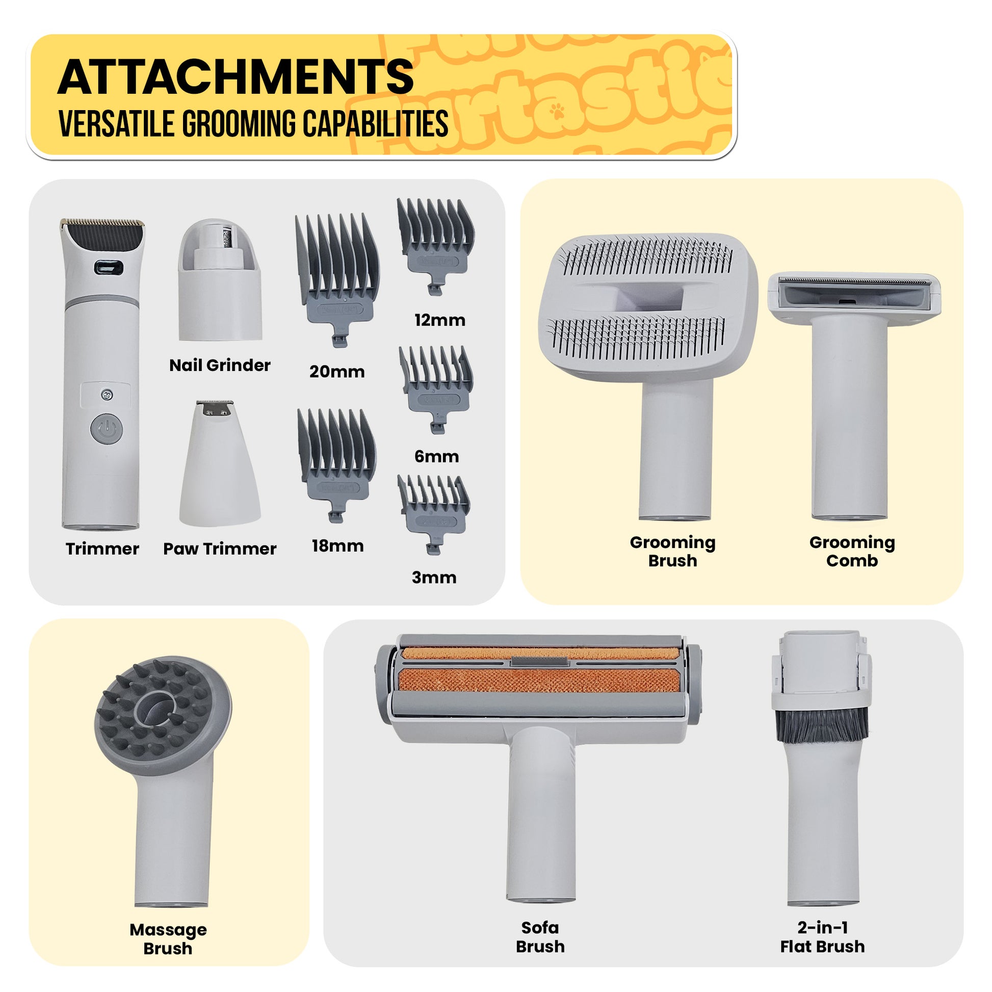 • 8 functional attachments: large trimmer, paw trimmer, grooming brush, grooming comb, nail grinder, massage brush, sofa brush and crevice brush