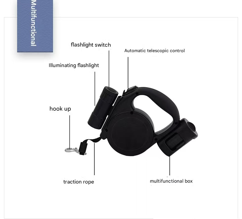Upgrade your dog walking experience with our All-in-One Retractable Dog Leash. This innovative leash combines three essential tools into one ergonomic handle, making your daily walks simpler, cleaner, and safer, especially after dark. Designed for durability and ease of use, it's the only leash you'll ever need.